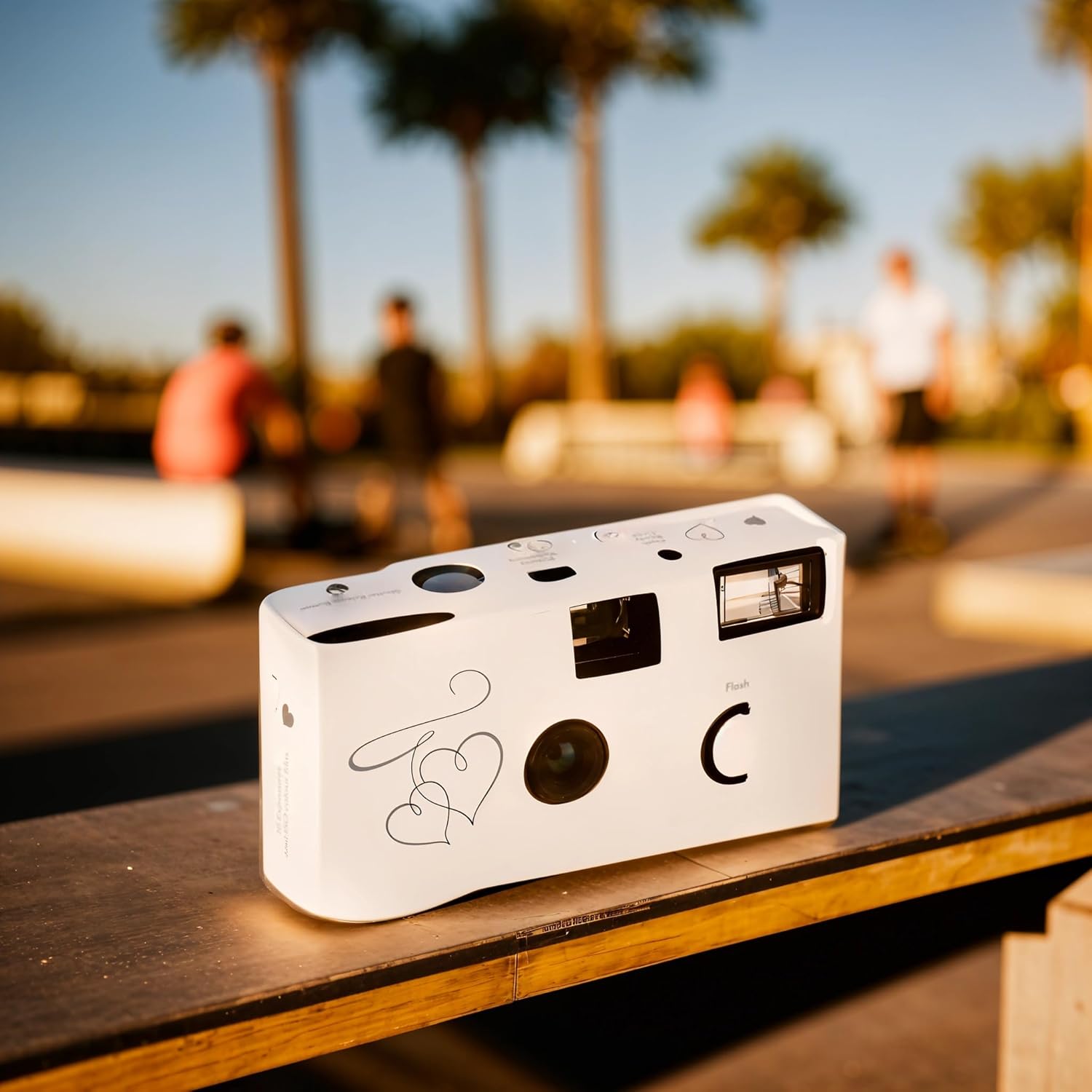 Capture the magic of your special day with the Weddingstar Disposable Camera with Flash. This single-use 35mm film camera is perfect for weddings or parties, serving as a fun and convenient way to capture memories. The Silver Enchanted Hearts design adds a touch of elegance to your event and makes for a lovely party favor for your guests.